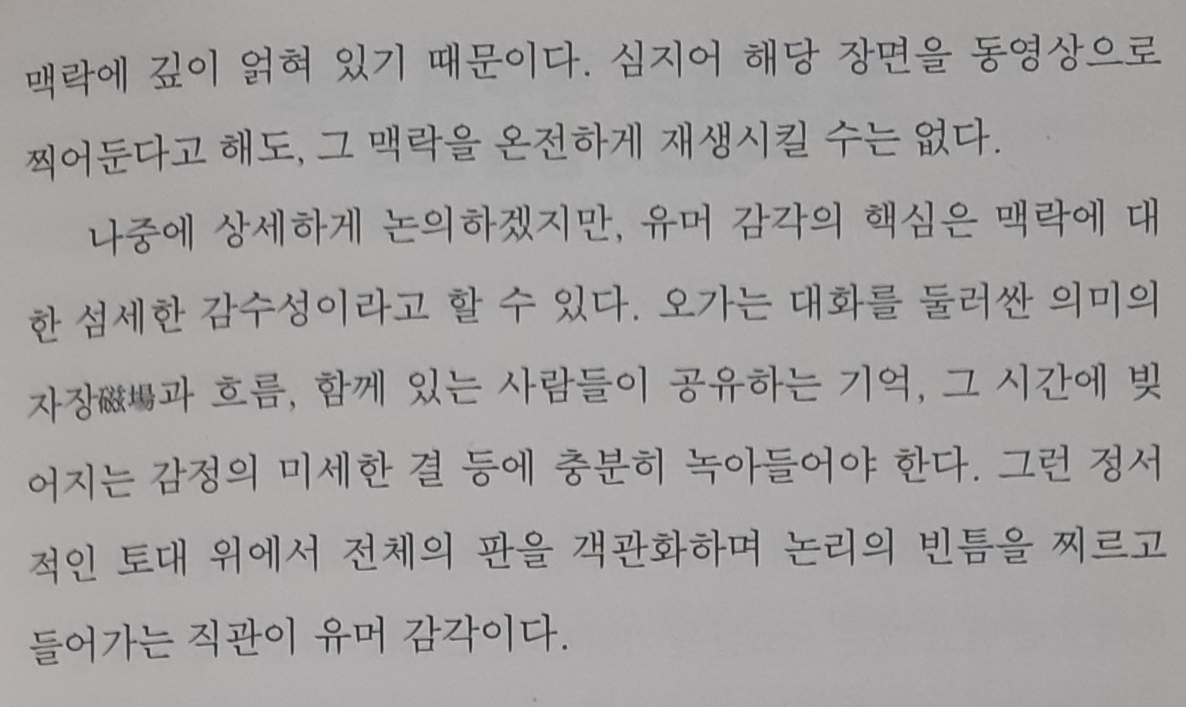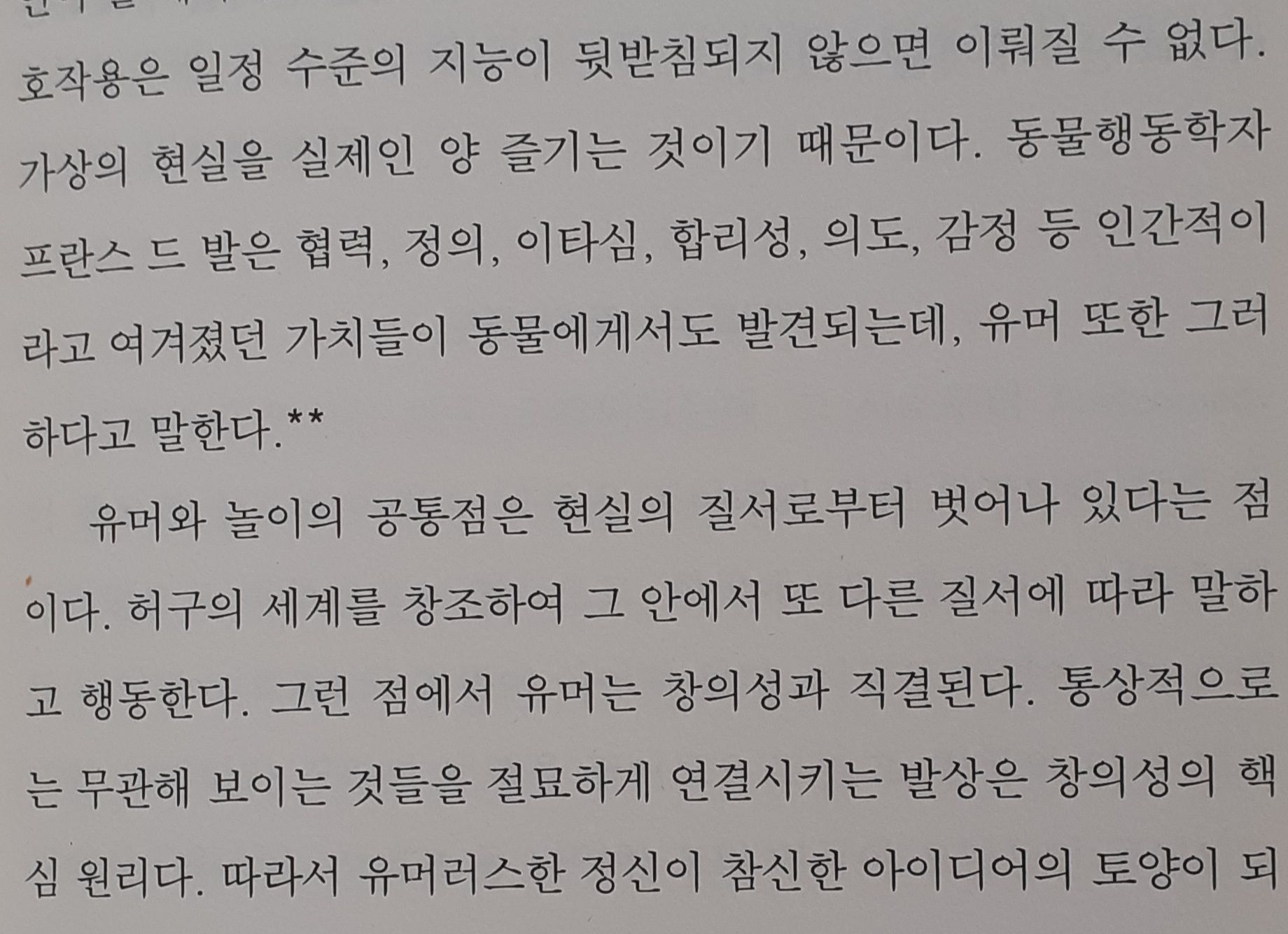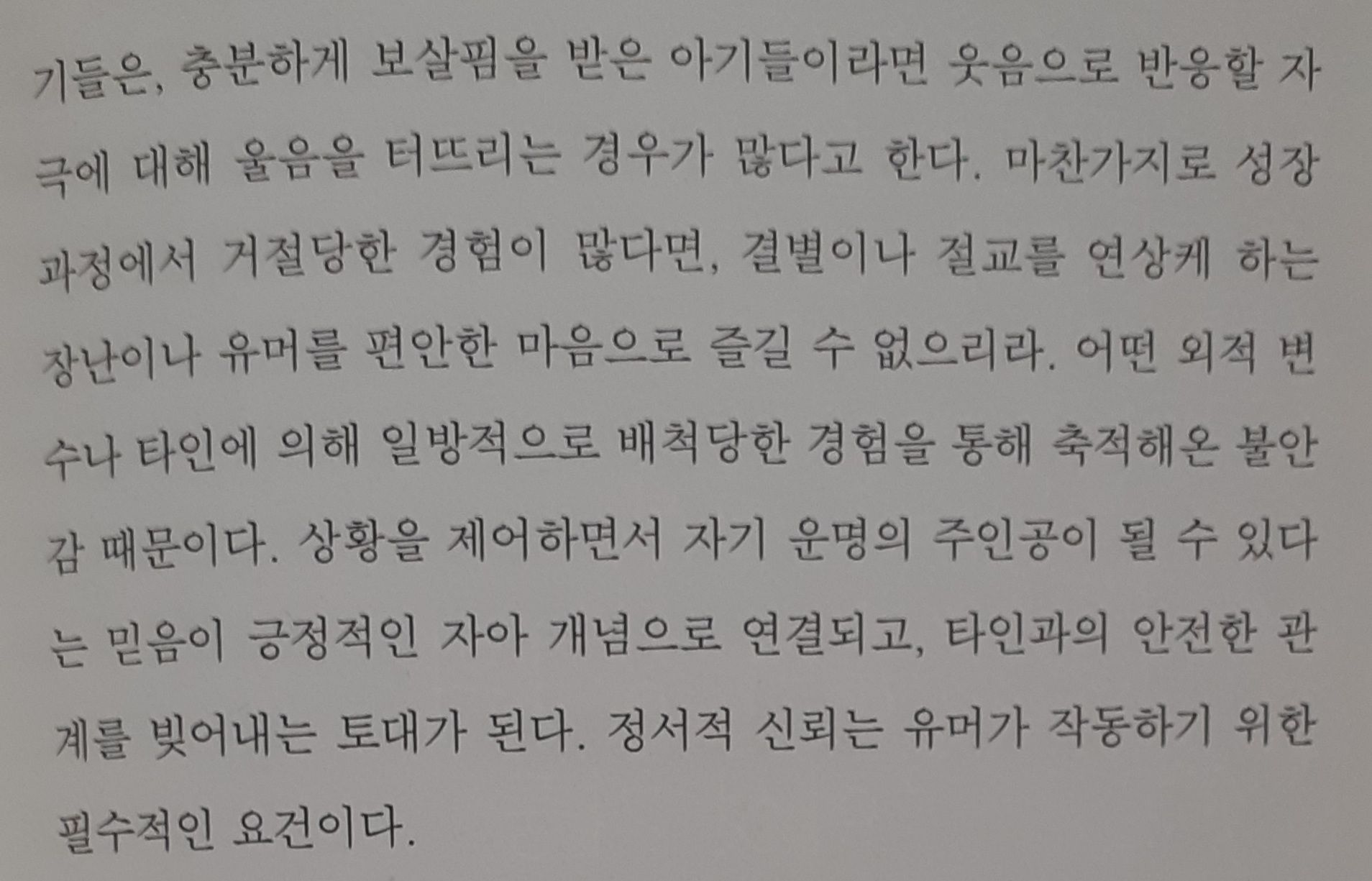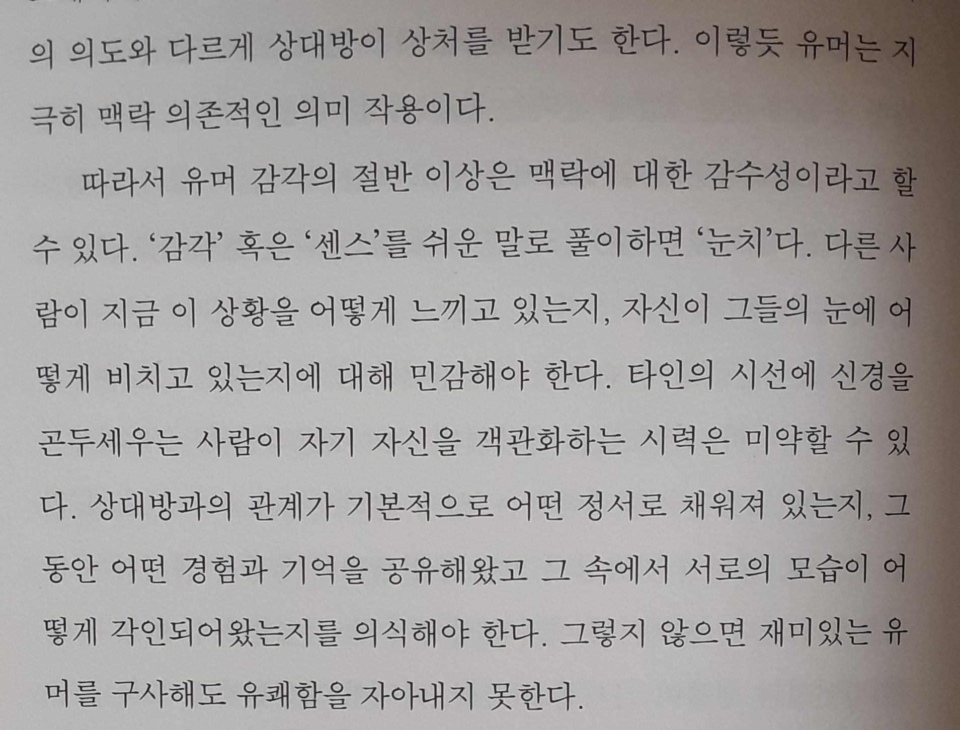 앞서 유머에 관해 알고자 읽었던 책으로 '웃음의 과학(이윤석 저)'가 있다. 이 책에서도 마찬가지로 '어떤 때 웃긴가?'에 대한 답은 찾지 못하였지만 유머니즘에 대한 감상은 긍정적이다.