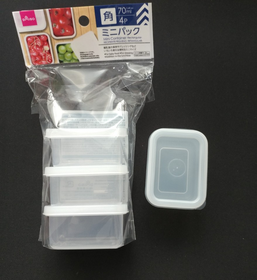 이 물건은 위의 소스통, 화과자케이스와 성격은 같은데 좀 더 비쌉니다. 소스통, 화과자케이스는 개당 40원~80원꼴인데 이건 개당 500원꼴이죠(2000원에 4개 들이로 판매). 70ml통은 좀 좁아서 보통은 100ml통이 더 좋습니다.