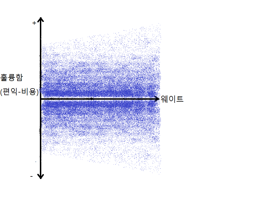 분포상 웨이트와 재미의 정(+)의 추세는 나타납니다.
